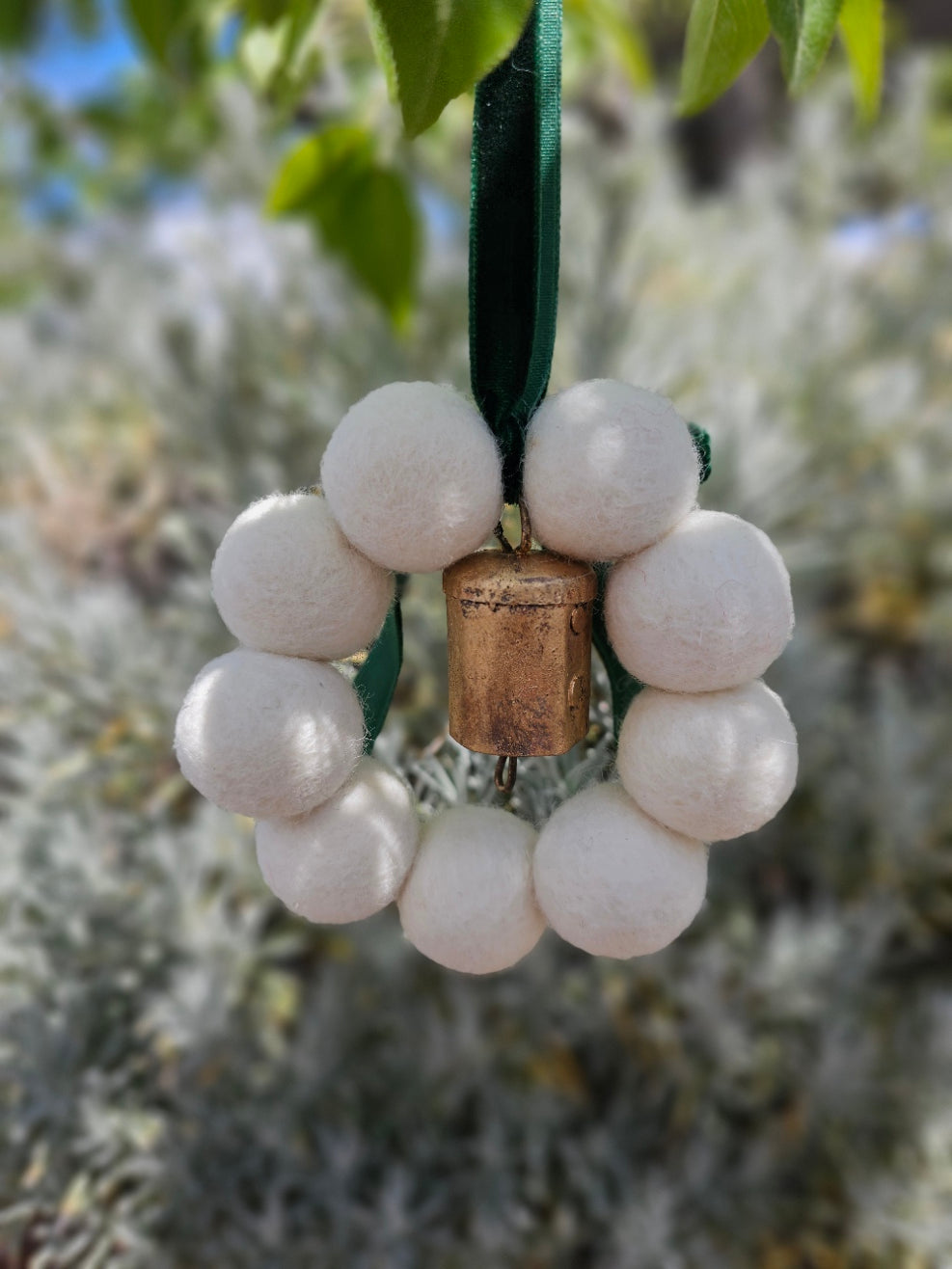 Embrace the creativity and charm of the festive season with a hand made felt wreath with a hand forged ringing bell.