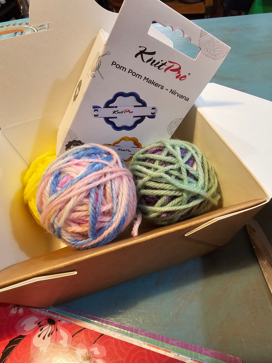 Kit includes vibrant wool and 2 small Knit Pro easy-to-use pom pom maker.