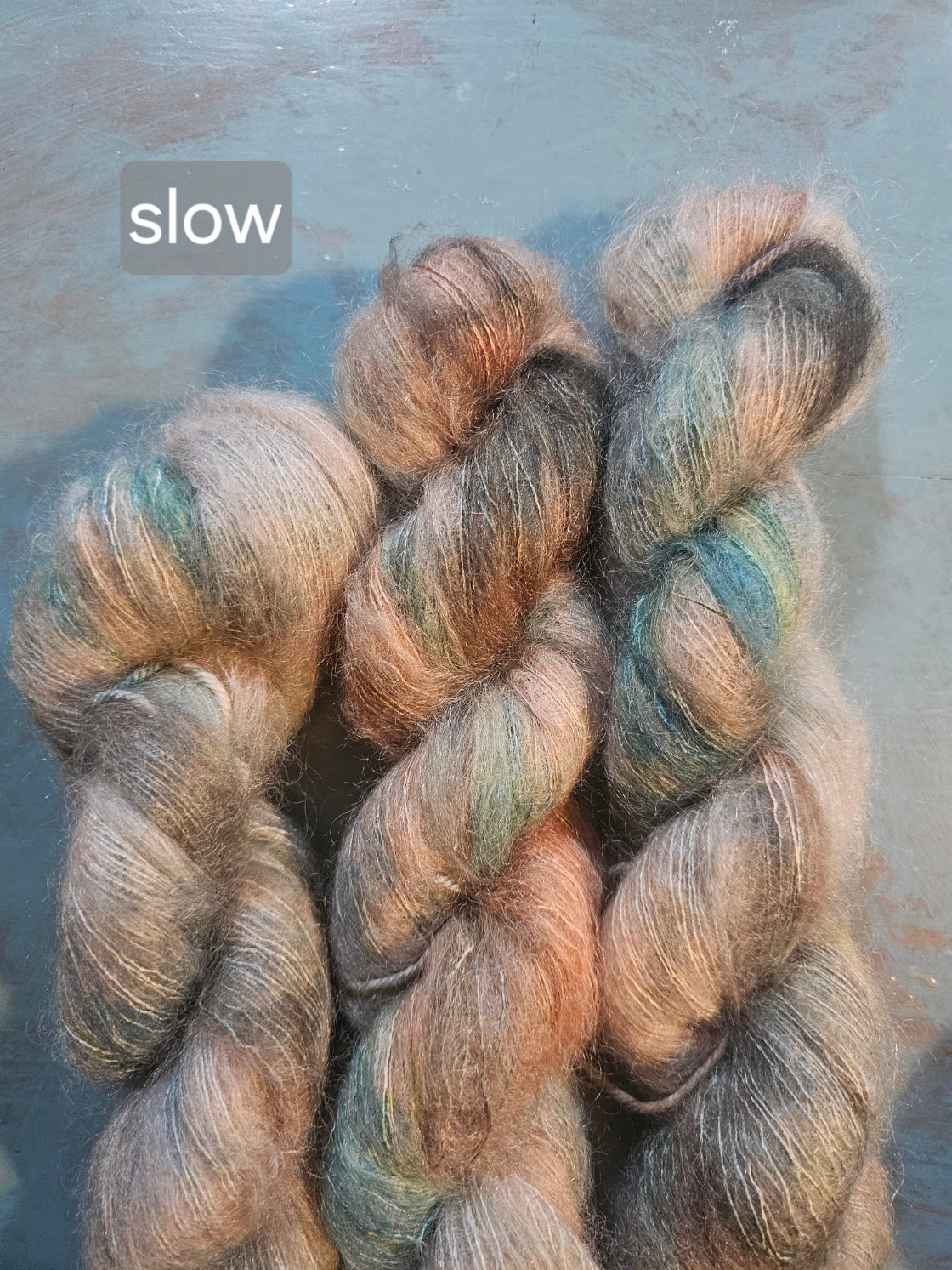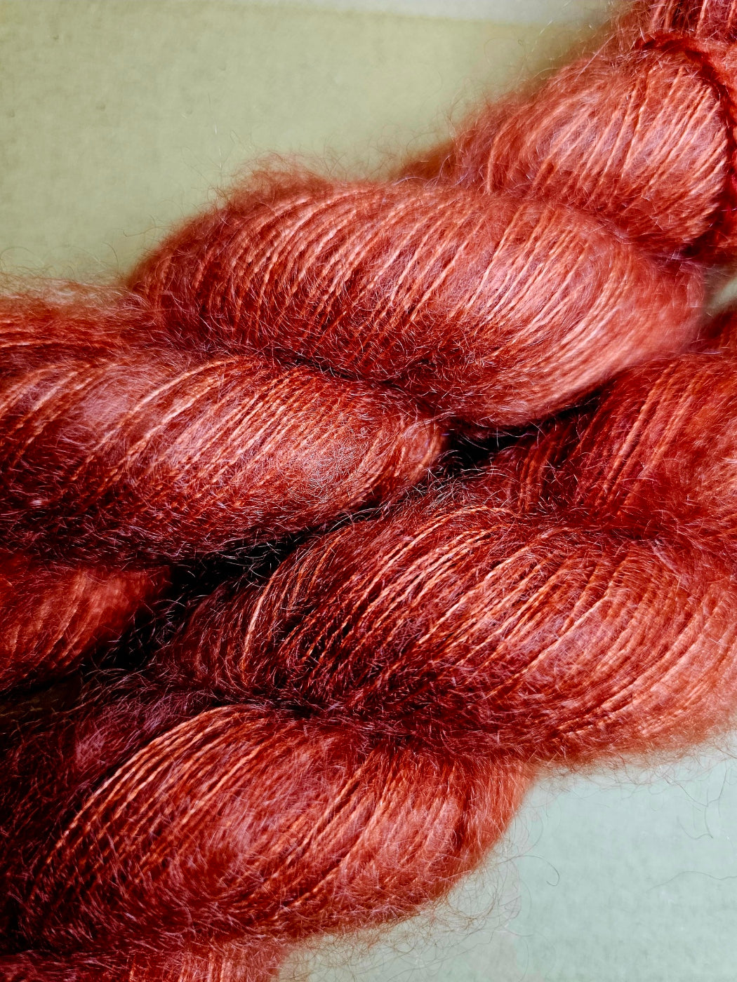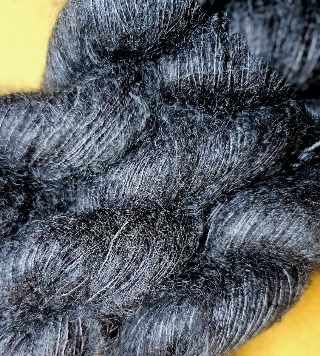 Hand dyed in Maldon VIctoria, this is a 72% Kid Mohair + 28% Mulberry Silk mix.